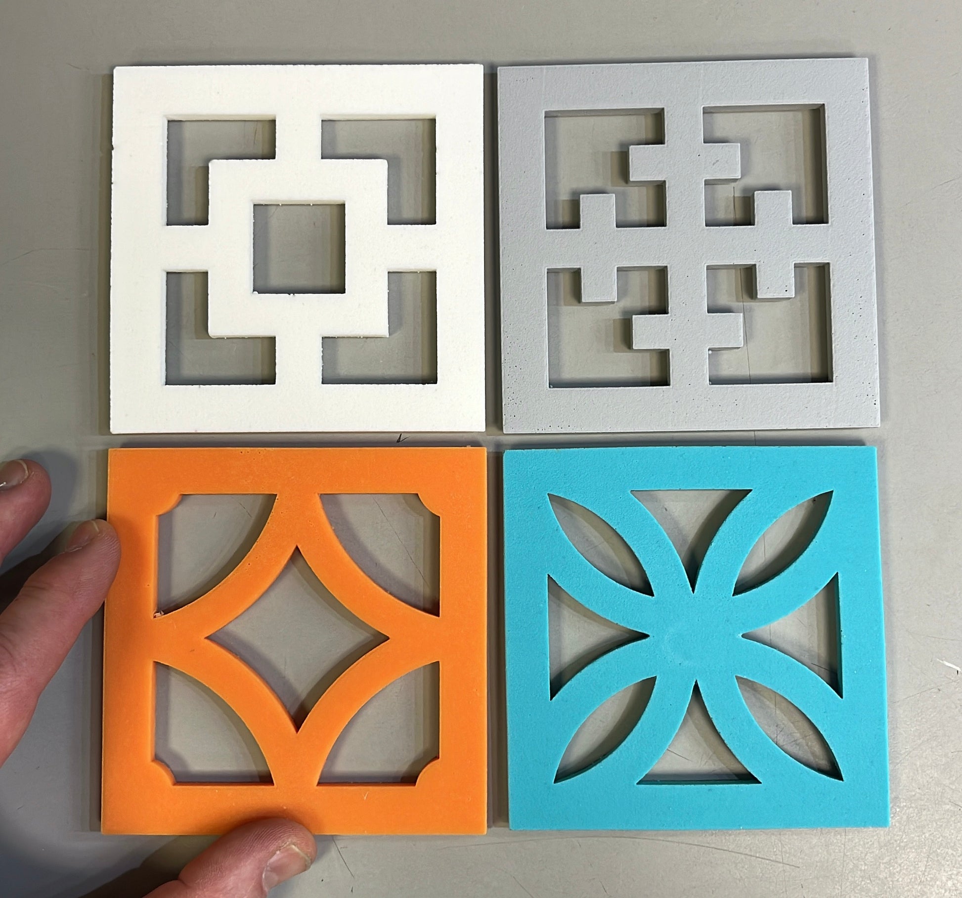 Four 4" x 4" hand-made Breeze-Block coasters. Each set includes four classic mid-century breeze block designs: Sunflower, Empress, Vista Vue and Maltese cast in custom-tinted resin.